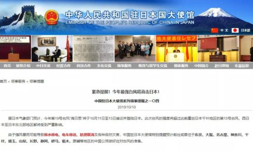 赴日游客及计划出行的中国公民请注意 1.及时关注天气状况,提前调整行程。请务必随时查看航班、轮渡、电车、高速公路的运行情况,提前改签或取消行程。由于台风可能引发交通瘫痪,请不要强行前往机场以免造成滞留。 2.远离河道、海边及山区,以免遭遇洪水或山体滑坡等自然灾害。部分景区可能会提前关闭,建议取消出行或更改为室内游览。 3.因台风属于不可抗力,可能导致航班取消且难以改签,请游客务必提前更改行程。遇滞留等情况,请理性看待、及时与航空公司协商解决,避免过度维权或卷入不必要的法律纠纷。 二、定居日本的中国公民请注意: 减少不必要的外出,远离低洼地带、河边、海边、山区。及时关注政府部门发布的避难指示、避难劝告等,必要时听从指挥前往避难场所。 准备好饮用水、应急食品、手电筒、手机充电器、常用药品等,以应对可能发生的停水停电。检查水电气设备,关闭门窗并用胶带加固窗户内侧。