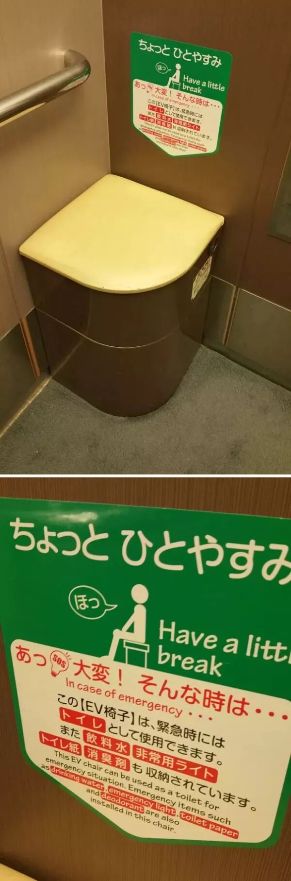 如果在乘坐电梯时忽然发生意外,电梯故障了怎么办?考虑到这种情况,日本人在电梯间里也设置了马桶座!是的,没错……这也是一个厕所!甚至连水,应急灯,纸张和除臭剂都为了准备好了……