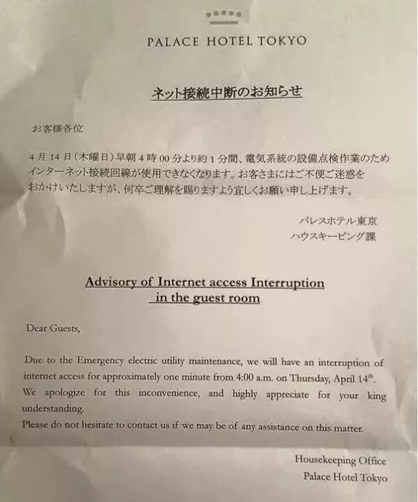 凌晨3,4点酒店忽然断网怎么办?你可能会觉得,这都不是事儿,大家也都睡觉了,偶尔有些夜猫子,第一时间也会打开自己的流量,转眼就把这事儿抛到脑后,可如果你住的是日本的酒店,酒店会第一时间贴出通知,表示自己的歉意。