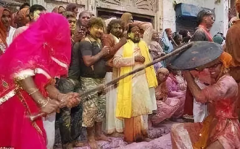 在印度,一向地位低下的妇女,每年夏季都有一个扬眉吐气的日子——“棒打男人节”。这一与众不同的节日主要是为了迎接多彩的春天到来。参与庆祝的男男女女,会事先在身上撒满彩粉和颜料。男人将全身涂上鲜艳的色彩,而妇女则会 穿上五颜六色的服装,头上裹着彩色的头纱,手拿竹竿“棒打男人”。男人们会用花瓣作为回击女人的“武器”。