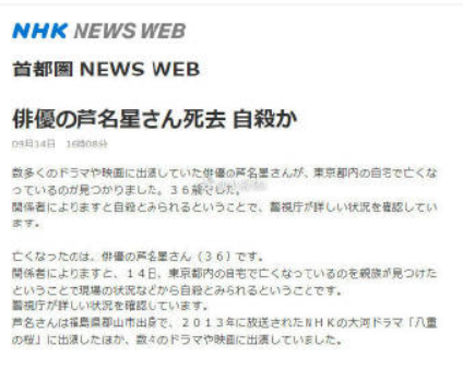 -新视线教育-米老师-阅(1134)导语:据《日刊体育》报道,9月14日,日本女演员芦名星被发现死于家中,年仅36岁。当时警方从现场情况分析,芦名星应该是死于自杀。15日,日媒报道日本警方确认芦名星是上吊自杀身亡。