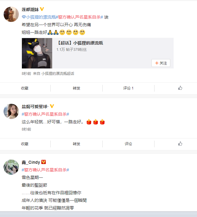 因为13日联络不到芦名星,早上芦名星哥哥在六点半进去其位于新宿的住处,在房间发现她已经没有气息,身旁有绳子,因此警方朝疑似是自杀的方向侦办。现场未有任何看似遗书的物品。邻居也说约同一时间还听到哥哥的哭叫声,平常晒衣服的时候都会在阳台看到芦名星,她都会打招呼。 《相棒》剧组工作人员也在受访时表示芦名星平常状态神情也没有什么异状,在最近的访问中她表示还想学打鼓、练武打。而芦名星生前参演的《相棒》第19季已经拍了,决议照常播出。 芦名星是日本影视演员、模特。2001年,芦名星因想成为模特,所以前往东京就读中学。在校期间,芦名星被星探发掘,如愿进入演艺圈,开启了模特之路。 除了拍杂志外,芦名星还参演了一些影视剧,比如《幸福的秘笈》《最后的圣诞节》。 2006年,芦名星从800多人的选拨赛中突出重围,获得了日本、法国、加拿大等五个国家联合投资30亿的电影《绢》的演出机会。从那时起,芦名星便开始专心致志经营演艺事业了。 2008年,芦名星首次担任连续剧主演,主演了富士电视台的原创剧《惜己》,后又搭档山田孝之、佐藤隆太、佐藤健等著名影星,给观众留下了许多脍炙人口的作品。 芦名星是模特出身,本就拥有颜值优异身材佳的先天优势,再加上她精湛的演技,独特的气质,芦名星受到了观众的大力喜爱。芦名星也被网友们视为日本传统美的最佳代言人,可见芦名星的人气之高。 这一噩耗一出,网上一片惋惜。 大好年华选择一种特别的方法结束生命, 希望在另一个地方能够开心快乐吧。 成年人的崩溃都是一瞬间的事 怕别人说你负能量, 怕别人久久不回复 要记得,自己永远是自己最好的朋友