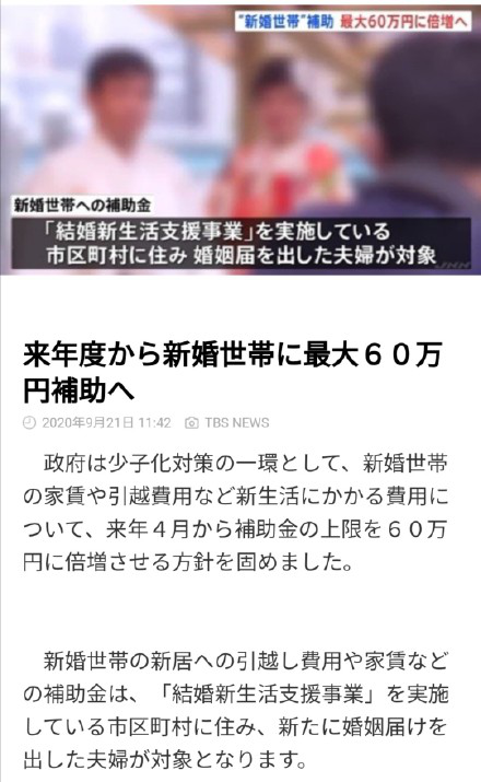 国家最多可以发60万日币的新婚补贴(折合人民币约4万)
