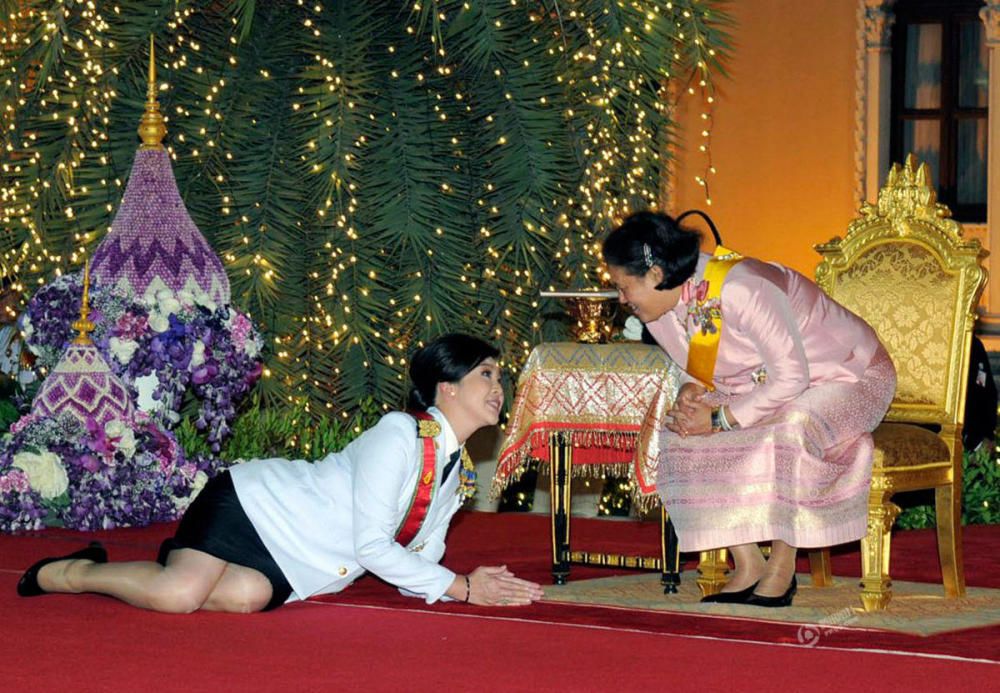 泰国前总理英拉在拜见泰国国王次女诗琳通公主时,行跪拜礼