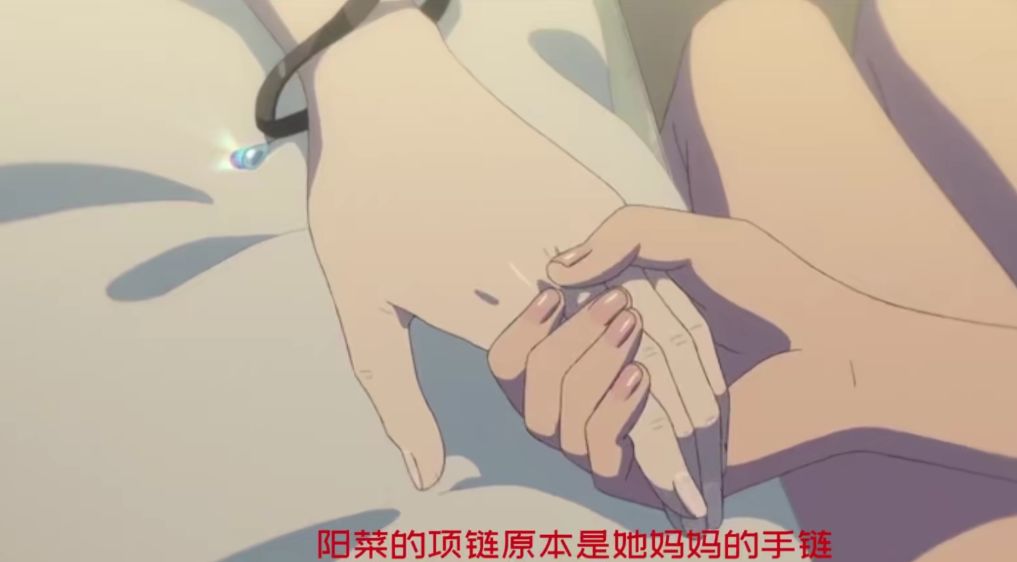 其实,电影里面有很多值得推敲的故事,首先,阳菜的妈妈,某一场景手上带水滴手链是香菜的项链!第二个,《麦田里的守望者》这本书多次出现在镜头中,