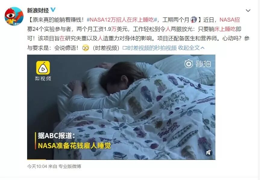 据悉,该项目由NAS和ESA(欧洲空间局)牵头,将在德国航天中心开展,目的为研究“失重”对人体产生的影响,卧躺状态接近失重状态,因此该研究使用卧躺来模拟失重状态,参与者每天将进入人造重力舱30分钟,以了解“人造重力”对于长期居住在空间站的宇航员是否有益,项目中有医生全程照料,还会配备营养师。 其实,这已经不是航天领域机构第一次做这样的试验了。早在2013年9月,NASA也招募过志愿者,请他们在床上躺70天,以便科学家通过模拟研究微重力对人体的影响。作为报酬,NASA将给志愿者每个月支付5000美元。70天下来,志愿者可以获得1万多美元的收入。 他们每天有16小时处在光明之中,另外8小时处在黑暗之中。其间,他们可以打电脑游戏、看电视、看书、上网,也可以安排亲朋戚友来探访,甚至还能躺在床上洗个澡。饮食全由NASA负责提供,前提是维持志愿者的正常体重。此外,他们还可以使用特制的床上健身器材。